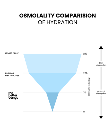 - Better Beings sits at an optimal 60–75 mOsm/kg, meaning it is absorbed significantly faster than ORS, sports drinks, or sugar-based hydration powders.