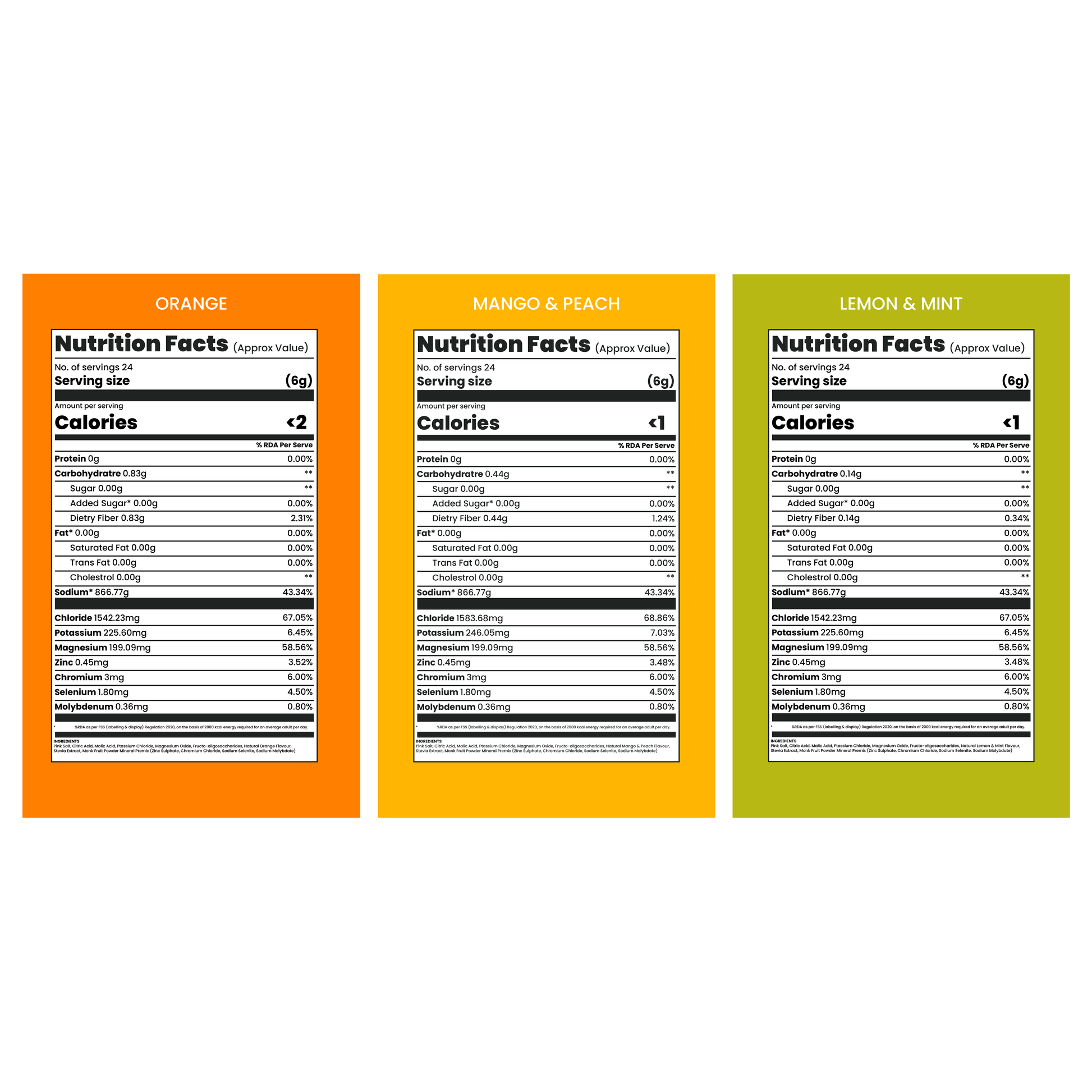 — with 3x faster hydration than water, zero sugar, and a perfectly balanced high-sodium formula. Each sachet is loaded with essential electrolytes: sodium, potassium, magnesium, and a trace mineral complex (zinc, selenium, chromium, molybdenum) that supports everything from muscle function to energy metabolism and immune resilience